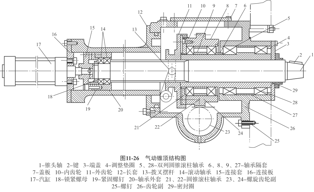 氣動(dòng)錐頂基本結(jié)構(gòu)如圖11-26所示。采用了15°螺旋齒輪副傳動(dòng)。由主傳動(dòng)帶動(dòng)螺旋齒輪副23、24旋轉(zhuǎn),再經(jīng)外齒輪11與內(nèi)齒輪10嚙合,通過錐頭軸上的花鍵帶動(dòng)錐頭軸轉(zhuǎn)動(dòng)。印版滾筒與錐頭軸上的鍵連接,即帶動(dòng)印版滾筒轉(zhuǎn)動(dòng)。當(dāng)需要停止氣動(dòng)錐頂轉(zhuǎn)動(dòng)時(shí),搬動(dòng)手柄(圖中未畫出),使撥叉擺桿13撥動(dòng)外齒輪與內(nèi)齒輪脫離嚙合。此時(shí),螺旋齒輪副轉(zhuǎn)動(dòng),但錐頭不轉(zhuǎn)動(dòng),這樣就可以完成裝上和拆下印版滾筒的操作。