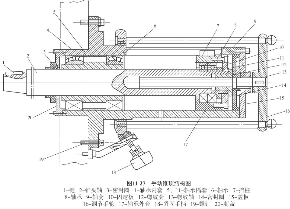在凹版塑料印刷機(jī)上,手動(dòng)錐頂結(jié)構(gòu)是印版滾筒的橫向調(diào)節(jié)裝置,是手動(dòng)錐頂利用氣體的可壓縮性來實(shí)現(xiàn)的,安裝在操作面的印版滾筒上。手動(dòng)錐頂基本結(jié)構(gòu)如圖11-27所示。手動(dòng)錐頂?shù)霓D(zhuǎn)動(dòng)是由氣動(dòng)錐頂?shù)霓D(zhuǎn)動(dòng)帶動(dòng)的。調(diào)整時(shí),首先松開緊固手柄,轉(zhuǎn)動(dòng)調(diào)節(jié)手輪16,并通過鍵帶動(dòng)螺紋軸轉(zhuǎn)動(dòng),使螺紋套在螺紋軸上左右移動(dòng)。通過固定板推動(dòng)軸承只能左右移動(dòng),并受到擋柱的限制而不能轉(zhuǎn)動(dòng),從而軸承推動(dòng)錐頭軸左右移動(dòng),即可以完成印版滾筒位置的橫向調(diào)節(jié)的目的。調(diào)節(jié)好以后,擰緊緊固手柄,以防止手輪轉(zhuǎn)動(dòng)而導(dǎo)致印版滾筒位置變化。